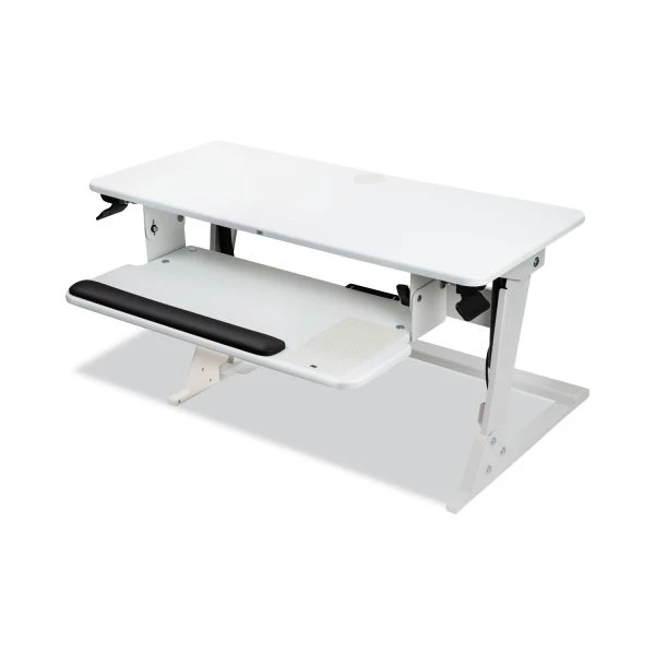 - Gas assisted continuous height adjustment allows you to move smoothly and quietly between sitting and standing positions in seconds.