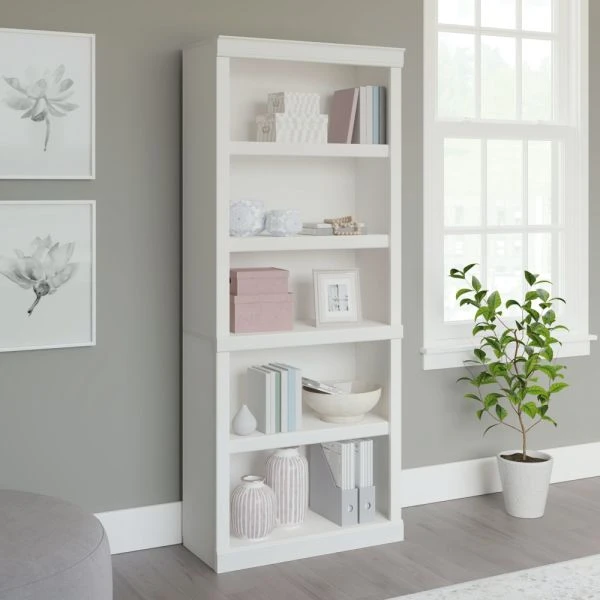 72″H 5-Shelf Bookcase, Arctic White – Prevent clutter from taking over your office with an elegant storage solution. This Realspace 72″H 5-Shelf Bookcase offers a style that reflects your upscale taste in furniture and has plenty of storage space. Arrange books, keepsakes, framed photos and your favorite awards along the shelves as well as accessory bins and baskets (sold separately) for loose supplies. The 3 adjustable shelves make it easy to accommodate the items you need and the pieces that help make your space feel personal.