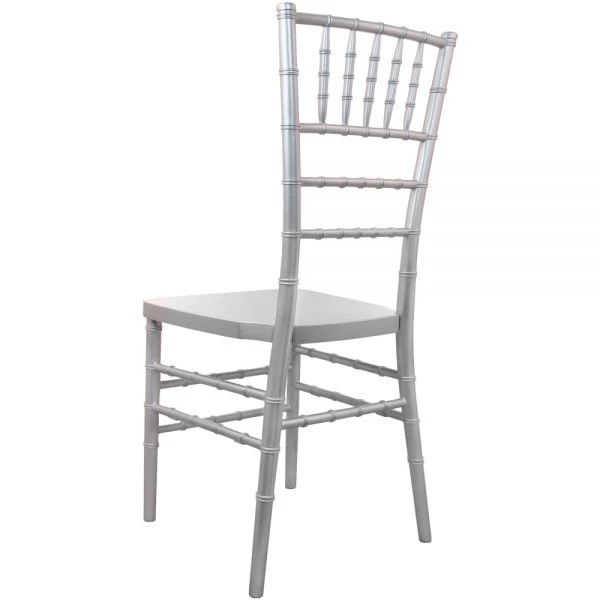 Advantage Silver Resin Chiavari Chair – This Silver Chiavari Chair will complement any elegant banquet, ballroom or wedding event while providing durable seating for guests. The resin frame on these ballroom chairs features a no screw, one-piece, full round spindle design along with a reinforced steel core construction, which is much stronger than average mono-block cores, adding structural integrity to each chair. Often used as a wedding chair, these Chiavari Chairs stack 8 high for convenient storage & transport.