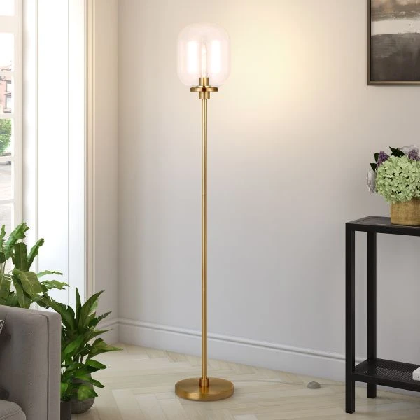Agnolo 69″ Tall Floor Lamp with Glass Shade in Brass/Seeded – This floor lamp is both dynamic and simplistic in its design. It lightens the mood with a seeded glass shade, bringing in natural textures to both the lamp and the room around it.