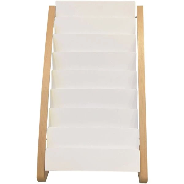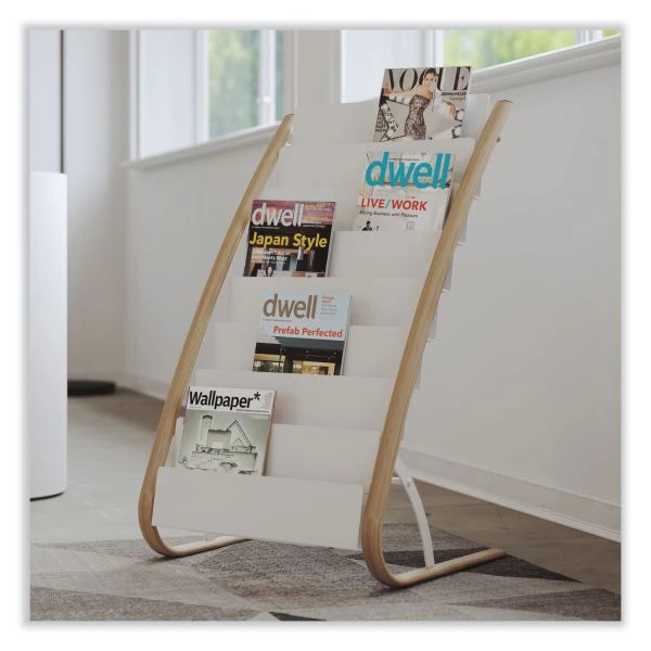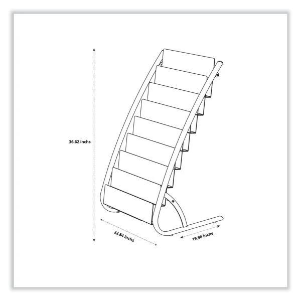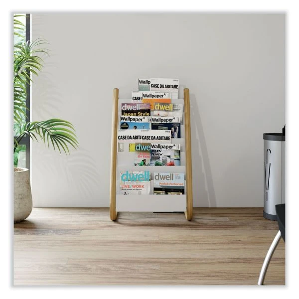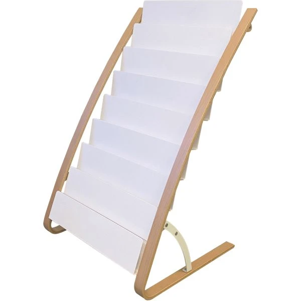 Alba Floor Display Unit – Enhance your reception areas with this Scandinavian-style display unit that mixes colors and materials. Combining style and elegance, this Floor Display with eight compartments features a modern design that fits perfectly into your reception and work spaces. It is the ideal accessory to display magazines or brochures. Each slanted, ABS plastic slot (1-1/2″/4cm deep) offers a low front for immediate identification of your literature and width that display – side by side – two documents measuring up to 9-11/25″ x 12-5/8″/24 x 32cm. Wide base and four nonslip pads provide reliable stability. Easy-to-assemble literature display frame is made of wood and steel.