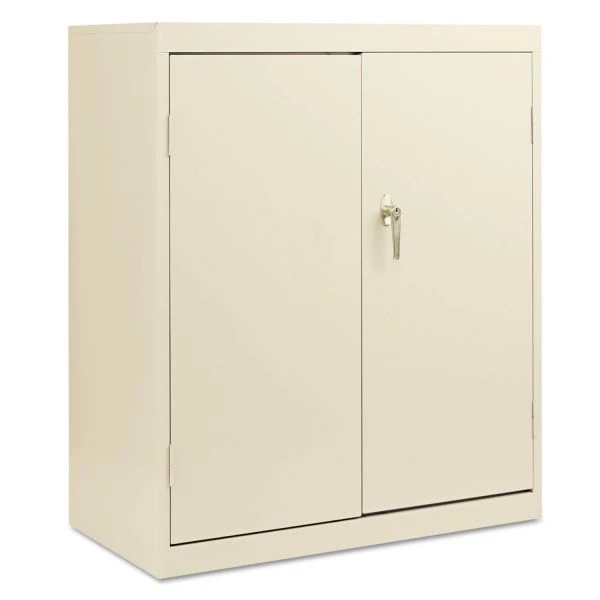 Alera Economy Assembled Storage Cabinet, 36w x 18d x 42h, Putty – Economy assembled storage cabinet with three-point locking bar system locks top, bottom, and doors. Durable, reinforced doors with satin chrome double handles open 180° for easy access to contents. Industrial-grade steel with powder coat finish for long lasting use. The sturdy, 16-gauge door frame prevents racking. Heavy duty secure knuckle hinges for longevity. Built-in leveling glides help compensate for uneven floors.