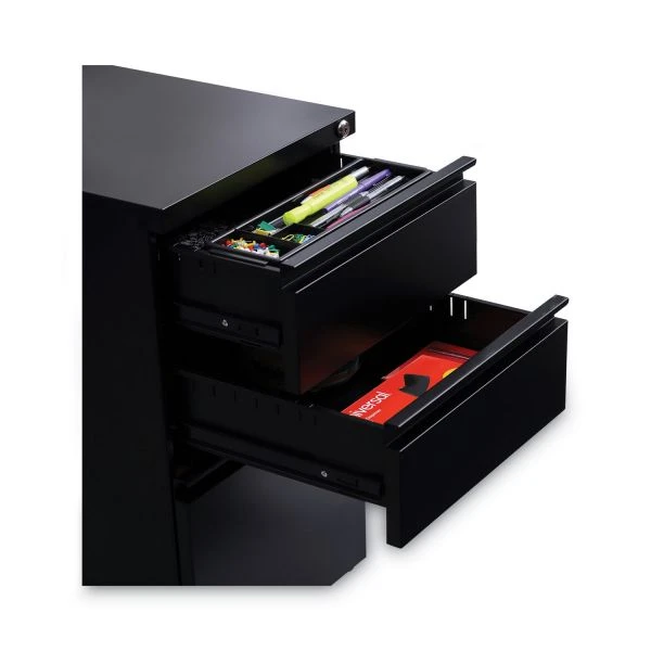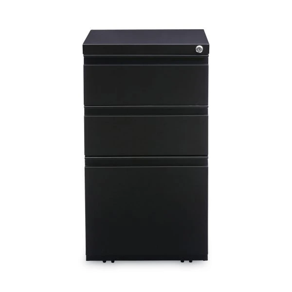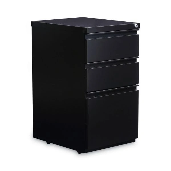 Alera File Pedestal with Full-Length Pull, Left or Right, 3-Drawers: Box/Box/File, Legal/Letter, Black, 14.96″ x 19.29″ x 27.75″ – Get organized with a high-sided file cabinet with drawers that accommodate letter or legal-sized hanging files. Steel ball bearing telescoping slide suspension helps drawers glide smoothly and with ease. The counterweight prevents tipping. Equipped with four casters, two locking, two non-locking. Full-length pull permits easy opening. Single key core removable lock with two keys. Durable powder coated finish helps prevent scratches.