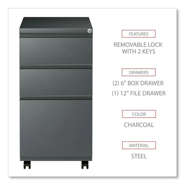 Alera File Pedestal with Full-Length Pull, Left or Right, 3-Drawers: Box/Box/File, Legal/Letter, Charcoal, 14.96″ x 19.29″ x 27.75″ – Get organized with a high-sided file cabinet with drawers that accommodate letter or legal-sized hanging files. Steel ball bearing telescoping slide suspension helps drawers glide smoothly and with ease. The counterweight prevents tipping. Equipped with four casters, two locking, two non-locking. Full-length pull permits easy opening. Single key core removable lock with two keys. Durable powder coated finish helps prevent scratches.