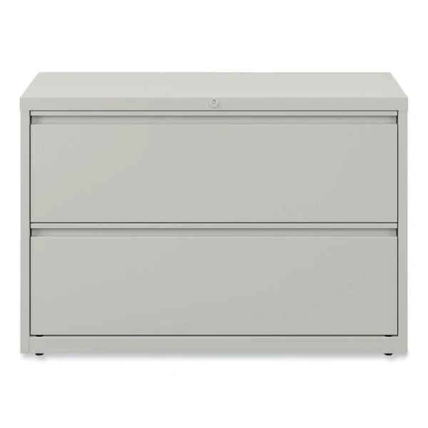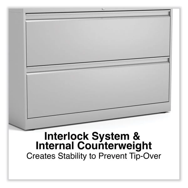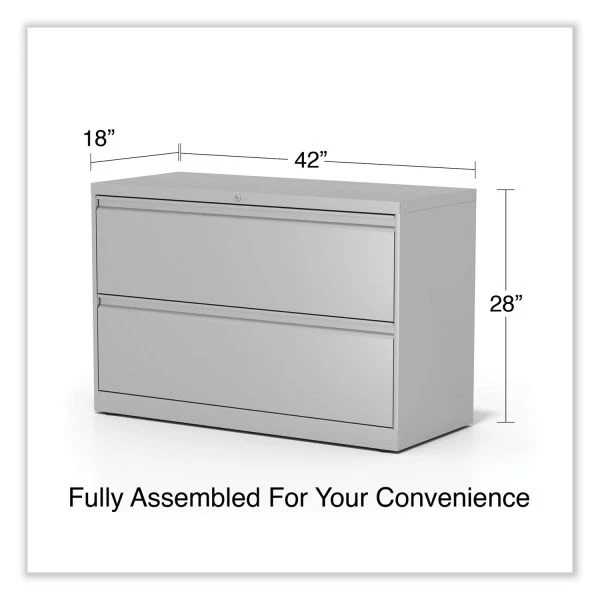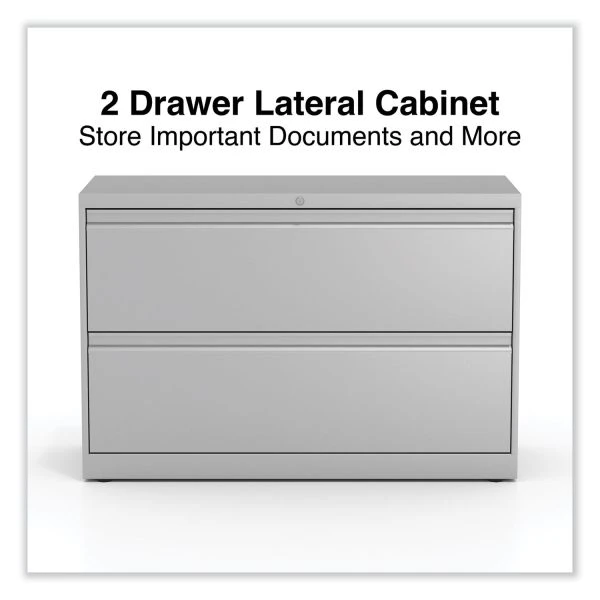 Alera Lateral File, 2 Legal/Letter-Size File Drawers, Light Gray, 42″ x 18.63″ x 28″ – Drawers with side-to-side hang rails to accommodate letter/legal hanging files. Full drawer extension on steel ball bearing telescoping slide suspension helps drawers glide with ease. Stylish, full-width radius edge recessed pulls help to quickly open and close drawers. Anti-tipping interlock system allows only one drawer to open at a time. Single key core removable lock with two keys. Four adjustable leveling glides. Durable powder coated finish helps prevent scratches.