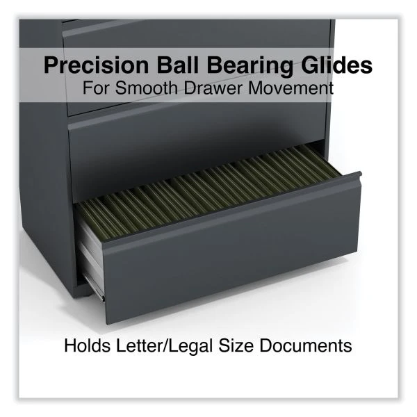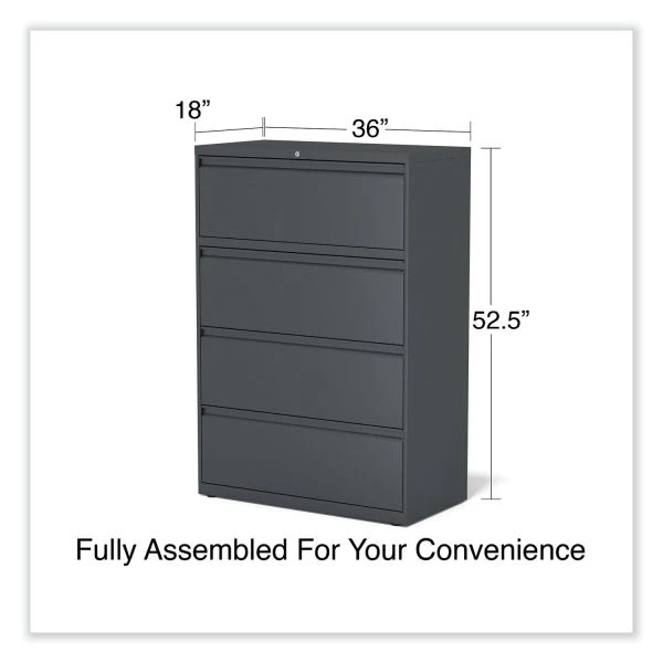 Alera Lateral File, 4 Legal/Letter/A4/A5-Size File Drawers, Charcoal, 36″ x 18.63″ x 52.5″ – Drawers with side-to-side hang rails to accommodate letter/legal hanging files. Full drawer extension on steel ball bearing telescoping slide suspension helps drawers glide with ease. Stylish, full-width radius edge recessed pulls help to quickly open and close drawers. Anti-tipping interlock system allows only one drawer to open at a time. Single key core removable lock with two keys. Four adjustable leveling glides. Durable powder coated finish helps prevent scratches.