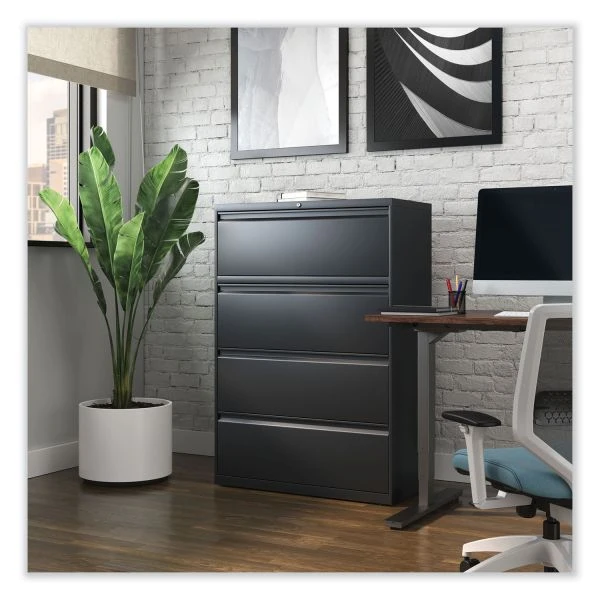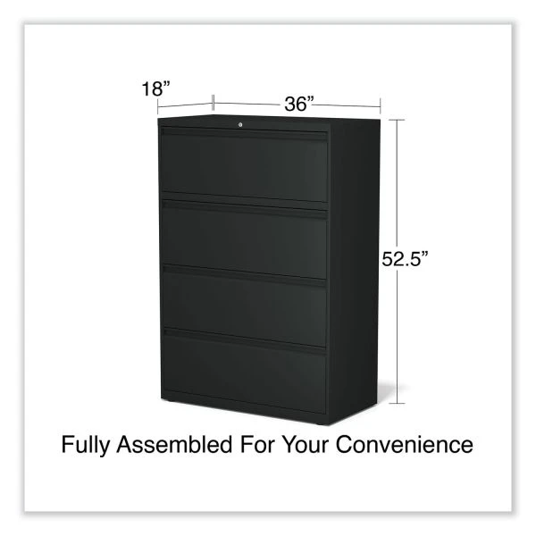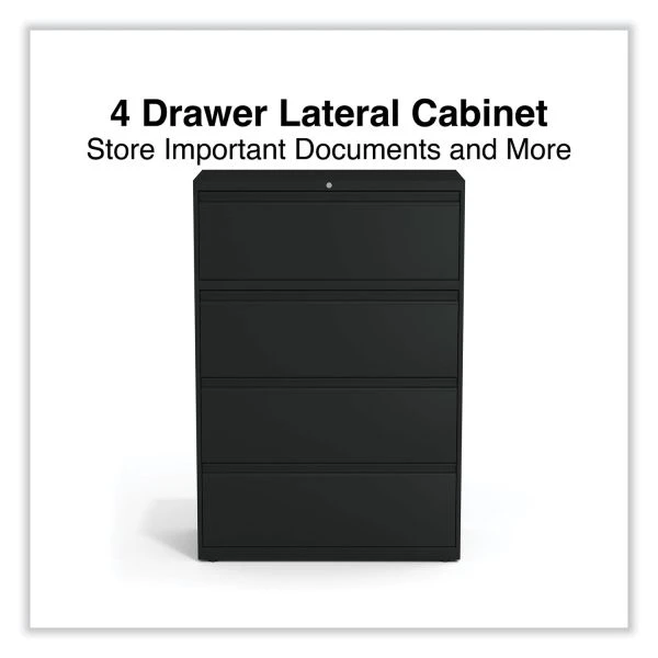 Alera Lateral File, 4 Legal/Letter-Size File Drawers, Black, 36″ x 18.63″ x 52.5″ – Drawers with side-to-side hang rails to accommodate letter/legal hanging files. Full drawer extension on steel ball bearing telescoping slide suspension helps drawers glide with ease. Stylish, full-width radius edge recessed pulls help to quickly open and close drawers. Anti-tipping interlock system allows only one drawer to open at a time. Single key core removable lock with two keys. Four adjustable leveling glides. Durable powder coated finish helps prevent scratches.
