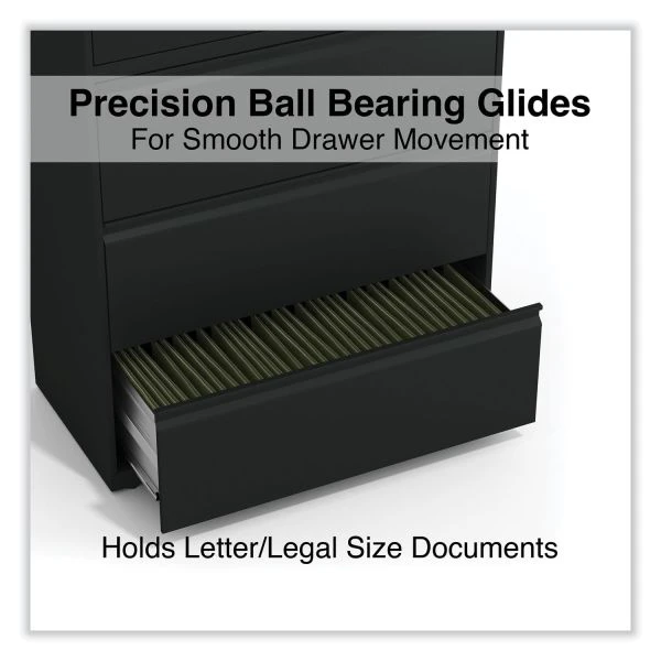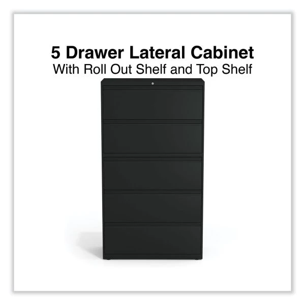 Alera Lateral File, 5 Legal/Letter/A4/A5-Size File Drawers, Black, 36″ x 18.63″ x 67.63″ – Drawers with side-to-side hang rails to accommodate letter/legal hanging files. Full drawer extension on steel ball bearing telescoping slide suspension helps drawers glide with ease. Stylish, full-width radius edge recessed pulls help to quickly open and close drawers. Anti-tipping interlock system allows only one drawer to open at a time. Single key core removable lock with two keys. Four adjustable leveling glides. Durable powder coated finish helps prevent scratches.