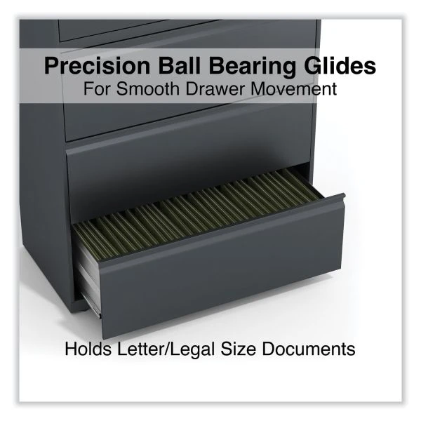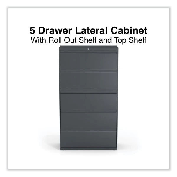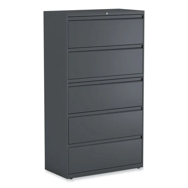 Alera Lateral File, 5 Legal/Letter/A4/A5-Size File Drawers, Charcoal, 36″ x 18.63″ x 67.63″ – Drawers with side-to-side hang rails to accommodate letter/legal hanging files. Full drawer extension on steel ball bearing telescoping slide suspension helps drawers glide with ease. Stylish, full-width radius edge recessed pulls help to quickly open and close drawers. Anti-tipping interlock system allows only one drawer to open at a time. Single key core removable lock with two keys. Four adjustable leveling glides. Durable powder coated finish helps prevent scratches.