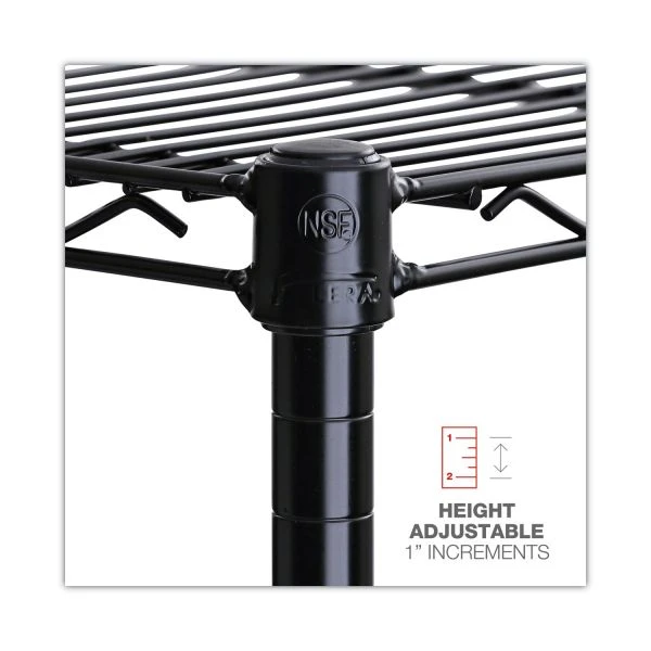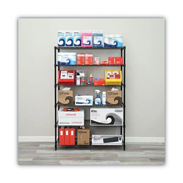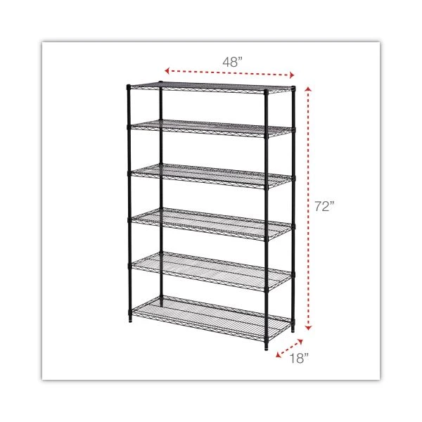 Alera NSF Certified 6-Shelf Wire Shelving Kit, 48w x 18d x 72h, Black – Ideal storage solution for commercial use. Snap-together design assembles in minutes. Strong welded wire construction provides exceptional strength and stability. Open design allows air circulation and reduces dust build-up. Includes six shelves, posts, shelf clips and leveling glides. Up to 600 lbs. per shelf (evenly distributed) when used without casters.
