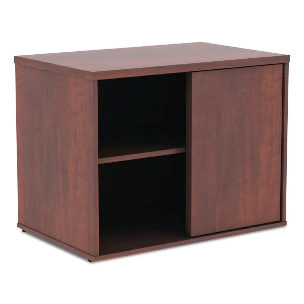 Alera Open Office Low Storage Cabinet Credenza, 29.5 x 19.13 x 22.78, Cherry – Sturdy low profile cabinet for storage or as a low credenza with your desk. These low credenza cabinets are great used as a return to expand your desk space to create “L” or “U” shaped desk configurations. Coordinating laminates for use with Alera® Valencia, Sedina, or Open Office Desk Series. Sliding doors are removable for open storage. Configurable left or right handed. Durable woodgrain laminate is scratch-, dent-, and water-resistant. Add a coordinated cushion top to expand your seating space with Alera® Credenza Cushions. Leveling glides compensate for uneven floors.