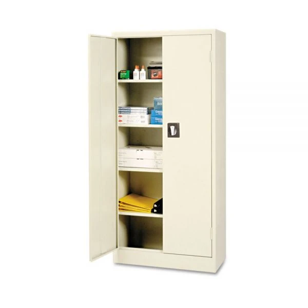 Alera Space Saver Storage Cabinet, Four Shelves, 30w x 15d x 66h, Putty – Alera Space-Saver Assembled Storage Cabinet is fully assembled and ready for immediate use. Built with commercial grade steel and reinforced doors for long-term performance at an attractive price. Recessed handle provides easy access without handles obstructing narrow aisle ways. Five openings and 150 lb capacity per shelf. Storage cabinet is electrostatically painted with a tough, long lasting powder finish to ensure years of lasting beauty. Shelves adjust in 2″ increments without tools. Raised base keeps contents out of harm’s way from cleaning liquids. Doors open 180° for easy access to contents. Four adjustable shelves.