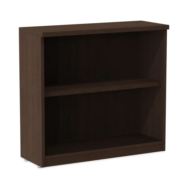 Alera Valencia Series Bookcase, Two-Shelf, 31.75w x 14d x 29.5h, Espresso – Woodgrain laminate bookcase features a contemporary design that fits perfectly in professional environments. Commercial-grade side panels with protective 3 mm edge banding provide excellent dent and scratch resistance. 11.75″ deep shelves accommodate a wide range of materials. Top and bottom shelf are fixed, middle shelf is adjustable. Top panel is 14″ deep for door installation. Tight, dowel, and cam-lock assembly provides a clean look while ensuring overall stability.