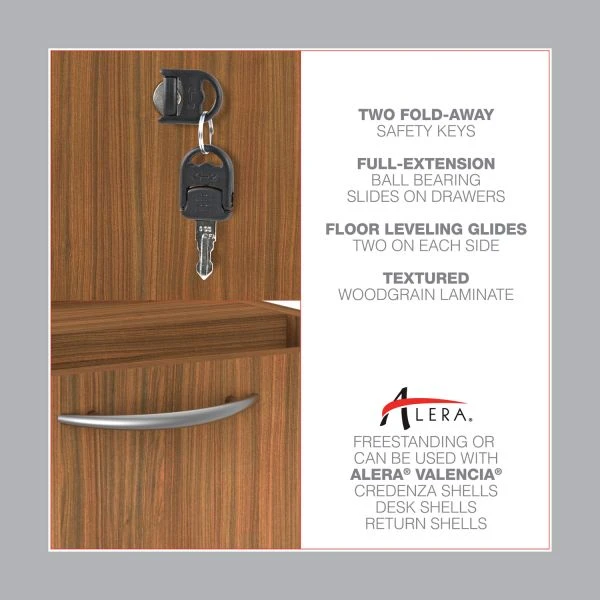Alera Valencia Series Full Pedestal File, Left/Right, 3-Drawer: Box/Box/File, Legal/Letter, Modern Walnut,15.63 x 20.5 x 28.5 – Freestanding pedestal file cabinet that attaches under worksurface. Sturdy, four-sided drawer construction with separate front panel. Full-extension ball bearing slides on file drawer. Drawers lock for securing contents. Durable 3 mm edge banding protects against bumps and dings. Two, fold-away safety keys for a slimmer profile are included.