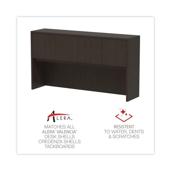 Alera Valencia Series Hutch with Doors, 4 Compartments, 64.75w x 15d x 35.38h, Espresso – Increase productivity and desktop space with this hutch. Handy compartmentalized overhead storage. Can be installed with included doors or without for easier access. Lighting valance and grommets to facilitate task lighting installation. Durable woodgrain laminate is water-, scratch-, and stain-resistant. Fully finished back. Accommodates optional Alera® Tackboards.