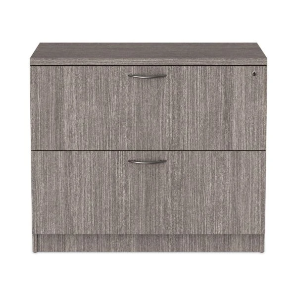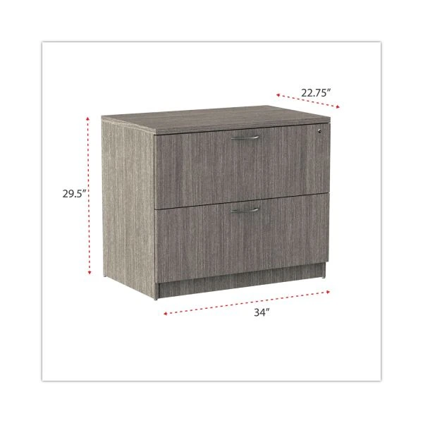 Alera Valencia Series Lateral File, 2 Legal/Letter-Size File Drawers, Gray, 34″ x 22.75″ x 29.5″ – Sturdy, four-sided drawer construction file cabinet with separate front panel. Durable construction that’s designed to resist water, scratches, and dents. Finish has a charcoal accent line under worksurface. Can be used as a freestanding file or in combination with credenza shell, which is sold separately. The top removes for installing under worksurface. Two, fold-away safety keys (included) for a slimmer profile.