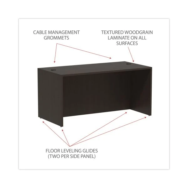 Alera Valencia Series Straight Front Desk Shell, 59.13″ x 29.5″ x 29.63″, Espresso – Durable, commercial grade laminate work surface and side panels are water, scratch, and stain resistant. The charcoal accent line under the work surface adds style and a distinctive touch. A protective edge banding helps to prevent damage from bumps. Two grommets for cable and wire management to tuck away your computer and device cords. Full-length modesty panel for added privacy.