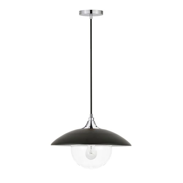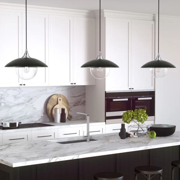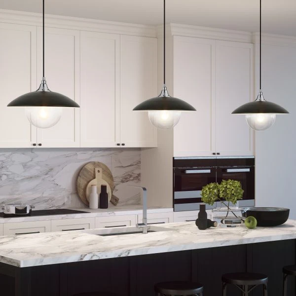 Alvia 14.5″ Wide Pendant with Metal/Glass Shade in Matte Black/Polished Nickel/Clear – Timeless and elegant, this pendant offers countless possibilities. Its classic styling complements a wide range of decor styles, whether in your living room, dining room, kitchen, or foyer. The exposed mechanical element of the screws pays homage to a nautical inspiration, but the warm neutral colors keep it updated with a modern look.