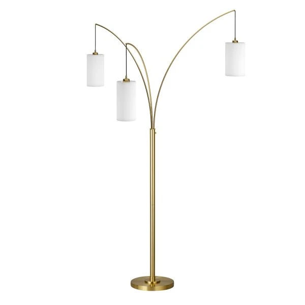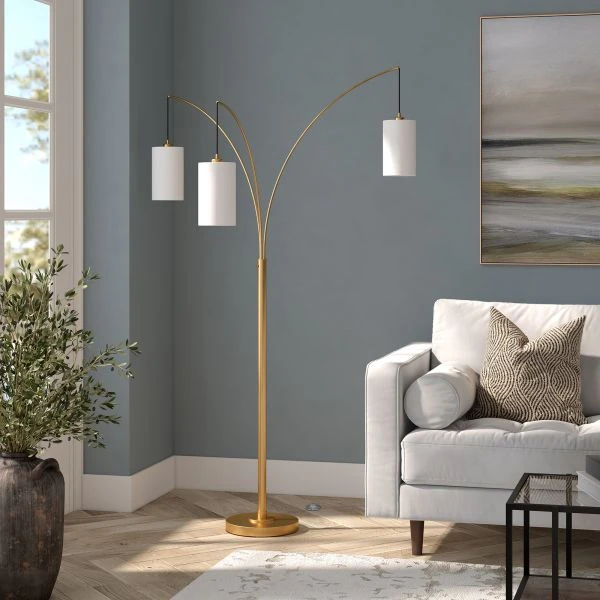 Aspen 3-Light Torchiere Floor Lamp with Fabric Shade in Brass/White – Create open concept design with this unique three-light floor lamp. The sleek metallic finish enhances its arched silhouette, offering a chic complement to contemporary decor. Three fabric drum shades in varying diameters are suspended from the adjustable arms, creating an intriguing pendant effect and allowing you to customize your lighting in any room.