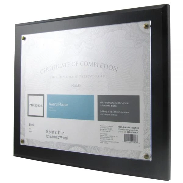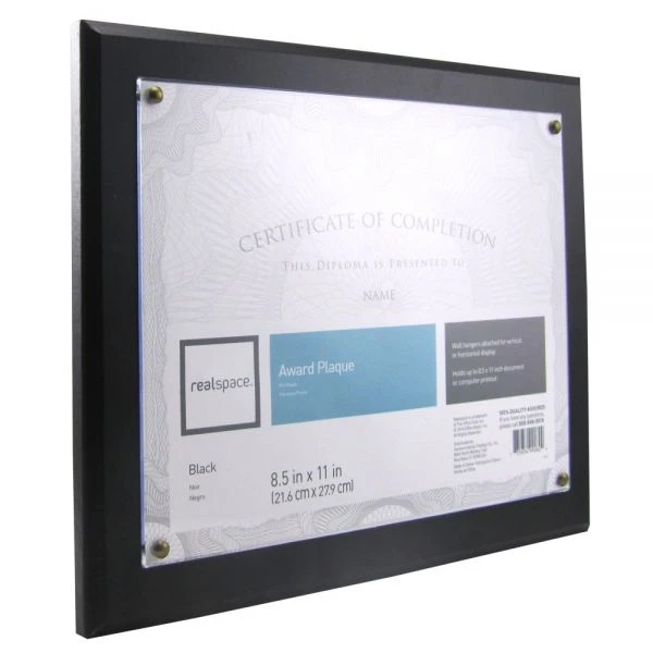 Award Plaque, 8-1/2″ x 11″, Black – Sleek and modern, the Realspace award plaque holds 8-1/2″ x 11″ papers, letting you display your certificate, photo or other document in style. Hang it vertically or horizontally in your office to commemorate your hard work.