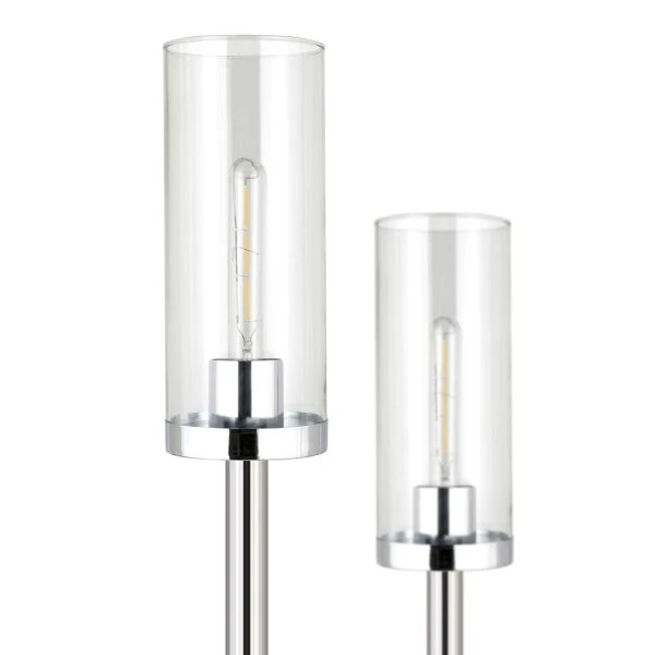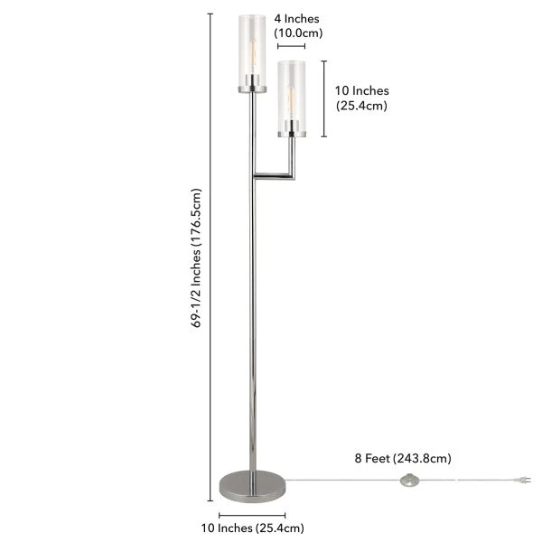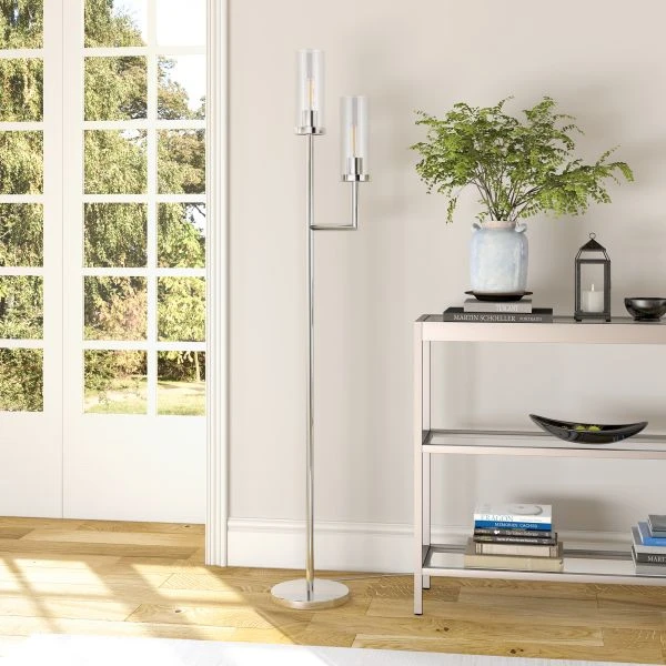 Basso 2-Light Torchiere Floor Lamp with Glass Shade in Polished Nickel/Clear – This brass floor lamp combines the natural elements of a hand blown glass shade for a clean but organic feel.