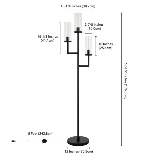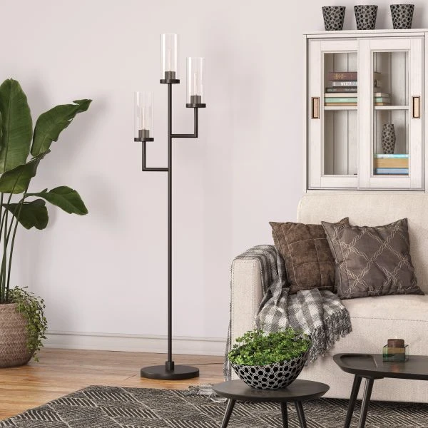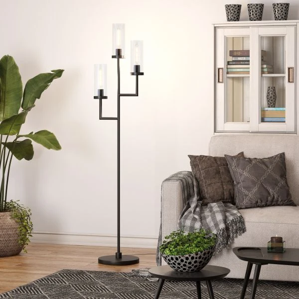 Basso 3-Light Torchiere Floor Lamp with Glass Shade in Blackened Bronze/Clear – This torchiere style floor lamp features three lights at different heights to cast a welcoming glow in any room. The neutral metallic tones allow this piece to be understated, yet refined. The rounded base and frame pair with the cylindrical glass shades to lend a soft, organic feel to its traditional shape.
