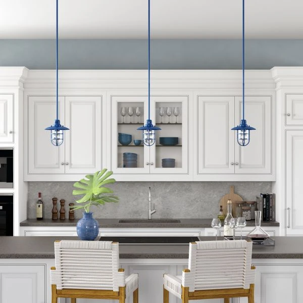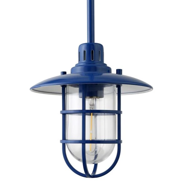 Bay 8.25″ Wide Lantern Pendant with Glass/Metal Shade in Blue/Clear – Brighten your kitchen, dining room, or foyer with this nautical-inspired pendant light. The globed glass shade is surrounded by a lantern-style frame, providing both direct and diffused light while allowing the statement light bulb of your choice to shine through. The handcrafted finish continues above the fixture onto the adjustable downrod, creating visual interest throughout the height of your space. This pendant is perfect for your coastal, cottage, or modern farmhouse décor.