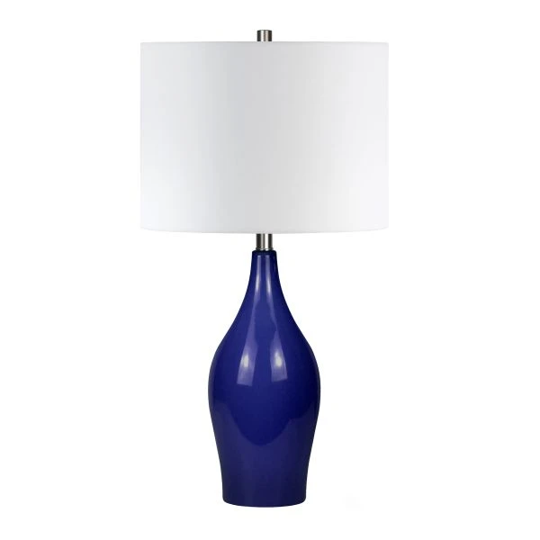 Bella 28.25″ Tall Porcelain Table Lamp with Fabric Shade in Navy Blue/White – The curved silhouette of the ceramic base adds elegance to rooms from the bedroom to foyer. The bottom base adds a nautical feel in navy blue. To level out the look, its single light bulb is highlighted by a crisp white French drum fabric shade in a crisp chiffon color.