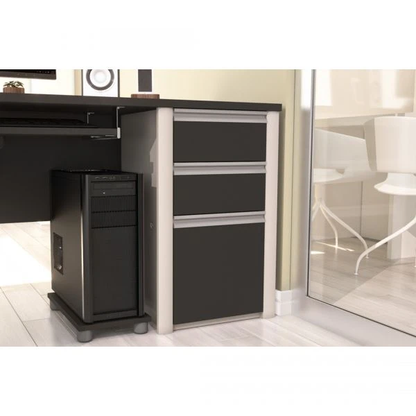 Bestar Connexion pedestal (ready-to-assemble) in Slate & Sandstone – Connexion is a contemporary and durable collection that features a wide variety of configuration options that will adapt to your specific needs. The pedestal offers two utility drawers and one file drawer with letter/legal filing system. Drawers on ball-bearing slides for smooth and quiet operation. One lock secures bottom two drawers. Also available in Bordeaux and Slate finish.
