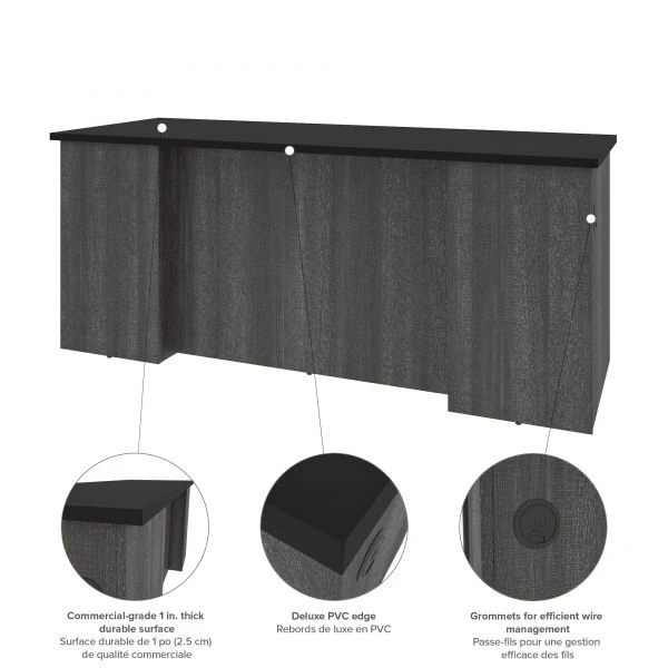 Bestar Norma Desk Shell – Black & Bark Gray – The Norma Collection is ideal for any type of office. You can easily arrange the pieces in this collection to fit your needs by adding a desk shell or a hutch. Keep your space organized with the multiple storage options. Not only will your space be clutter-free, it will also feel modern and stylish thanks to the two-tone design and the metal handles with black finish. Enhance your space with this affordable collection! 1″ thick work surface with a melamine finish that resists scratches, stains and wear. This desk shell features a spacious workspace with 2 grommets for efficient wire management. Finished back. Levelers to adapt to any floor irregularities. PVC edges. Made of laminated, high-density commercial-grade particle board, compliant with Carb phase 2. Meets or exceeds ANSI/BIFMA safety and performance standards.