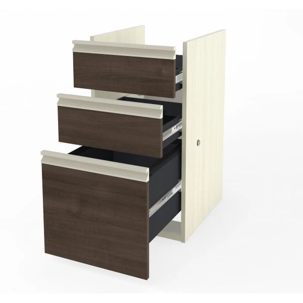 Bestar Prestige + pedestal (ready-to-assemble) in White Chocolate & Antigua – Prestige + is a timeless modular collection that will adapt to your needs, over time. With its wide range of products, it is ideal for every type of office. The pedestal offers two utility drawers and one file drawer with letter/legal filing system. Drawers on ball-bearing slides for smooth and quiet operation. One lock secures bottom two drawers. Finished with classic moldings.