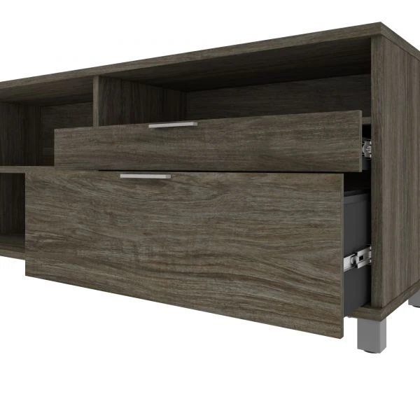 Bestar Pro-Linea Credenza with two drawers in Walnut Grey – Pro-Linea has all the elements to create a modern and refined work environment. The clean lines of this collection bring a fresh look without compromising functionality and durability. Durable 1″ commercial grade work surface with melamine finish that resists scratches, stains and wear. Deluxe thick PVC edge. The credenza features metal legs, one utility drawer, one file drawer with letter/legal filing system and three shelves, one of which is adjustable. Drawers on ball-bearing slides for smooth and quiet operation. Fully reversible unit.
