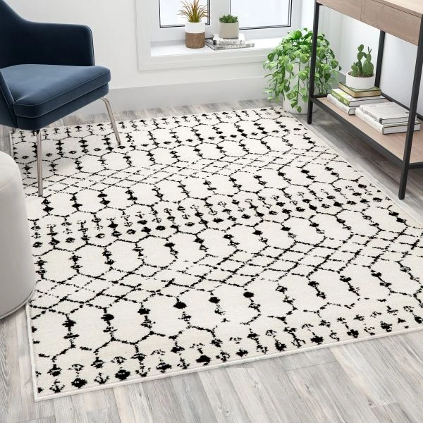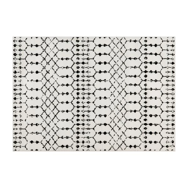 Beth Geometric Bohemian Low Pile Rug – 5′ x 7′ – Ivory/Black – Instantly change the look of your living space and add an on-trend, sophisticated twist with this low pile bohemian style area rug. A geometric design area rug can effortlessly transform the look and feel of a room without breaking the bank plus area rugs have practical benefits as well. If your flooring has flaws that you don’t want visitors to notice or tends to get cold when the temperature drops, a modern style area rug will lend chic style while hiding an eyesore as well as keeping your feet warm. Long lasting, comfortable and budget friendly are the bywords of a busy household and this floor rug won’t disappoint. Made from lightweight but highly durable micro polyester, this rug is fade and stretch resistant to retain it’s great looks and polyester is super soft to feel plush on your feet. Highly affordable and free of allergens, this microfiber area rug will help both you and your wallet breath easier. Nobody has time for high-maintenance items so stain resistance and ease of cleaning make this beautiful area rug a must have. Dirt is quickly vacuumed away while water-based spills can be blotted with a dry cloth. Ideal for your living room, family room, home office or den, this thick area rug will be an asset to any decor.
