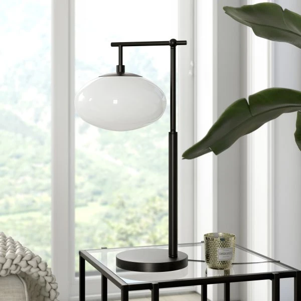Blume 25″ Tall Arc Table Lamp with Glass Shade in Blackened Bronze/White Milk – The clean and modern lines of this table lamp, paired with its glass globe shade adds a visual interest to any room. The L-shaped frame allows light to shine directly on your workspace or reading nook. The handmade globe shade creates a subtle vintage look, while still maintaining a contemporary look and feel. This table lamp is the perfect companion to your living room, bed side table, workspace and more.