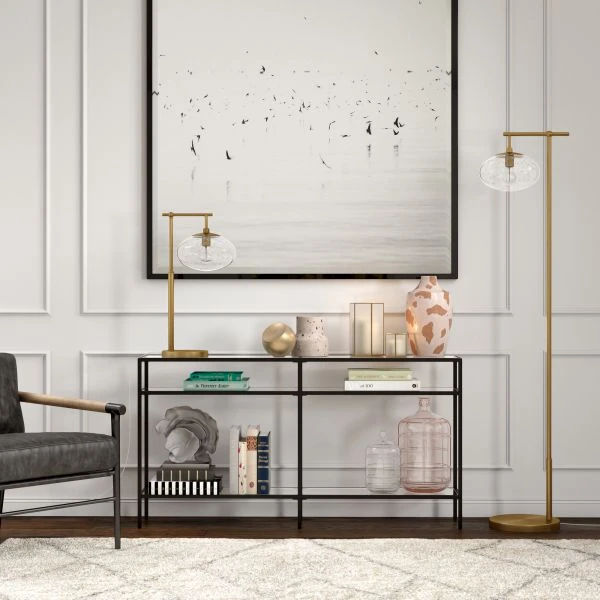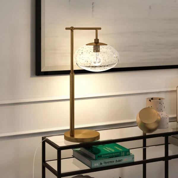 Blume 25″ Tall Arc Table Lamp with Glass Shade in Brushed Brass/Seeded – The clean and modern lines of this table lamp, paired with its glass globe shade adds a visual interest to any room. The L-shaped frame allows light to shine directly on your workspace or reading nook. The handmade globe shade creates a subtle vintage look, while still maintaining a contemporary look and feel. This table lamp is the perfect companion to your living room, bed side table, workspace and more.