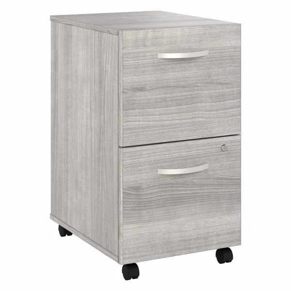 Bush Business Furniture Hybrid 2 Drawer Mobile File Cabinet in Platinum Gray – Assembled – The Bush Business Furniture Hybrid 2 Drawer Mobile File Cabinet offers a stylish, long-lasting storage solution for the modern professional. Enjoy a neat and organized workspace with a filing cabinet that conveniently rolls wherever you need access to important documents. Drawers open on smooth full-extension ball bearing slides for an effortless reach to letter, legal and A4-size paperwork. Both drawers can be secured by a single lock to protect sensitive files or personal items. The rolling file cabinet’s compact design allows it to fit underneath a standard size office desk for a space-saving configuration. Find the perfect look for your space with five contemporary finish options: Black Walnut, Modern Hickory, Platinum Gray, Storm Gray and White. This 2 drawer file cabinet with wheels has been meticulously tested to meet or exceed ANSI/BIFMA quality standards for safety, durability and performance and is backed by the Bush Business Furniture 10 Year Manufacturer’s Warranty. See the full Hybrid Collection for coordinating items to enhance your workspace as needed, including Computer Desks, Bookcases and Storage Cabinets (coordinating items sold separately). American made with U.S. and imported parts.
