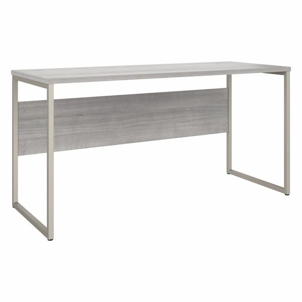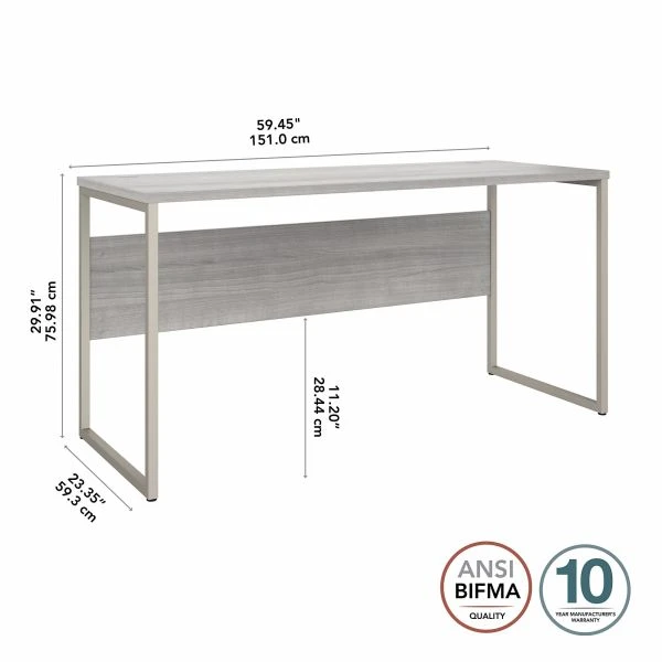 Bush Business Furniture Hybrid 60W x 24D Computer Table Desk with Metal Legs in Platinum Gray – The Bush Business Furniture Hybrid 60W x 24D Computer Table Desk blends a durable work surface with sturdy metal legs to offer a stylish, long-lasting solution for the modern professional. Tackle your next project or assignment with a computer, books, paperwork and more on a desktop that supports up to 200 pounds. Two built-in wire management grommets keep cords and cables in order, so your work area remains free from unnecessary clutter. The Computer Desk’s open leg design and finished privacy panel allow it to look great facing any direction in a home or professional office environment. Find the perfect look for your space with five contemporary finish options: Black Walnut, Modern Hickory, Platinum Gray, Storm Gray and White. This modern desk has been meticulously tested to meet or exceed ANSI/BIFMA quality standards for safety, durability and performance and is backed by the Bush Business Furniture 10 Year Manufacturer’s Warranty. See the full Hybrid Collection for coordinating items to enhance your workspace as needed, including File Cabinets, Bookcases and Storage Cabinets (coordinating items sold separately). American made with U.S. and imported parts.
