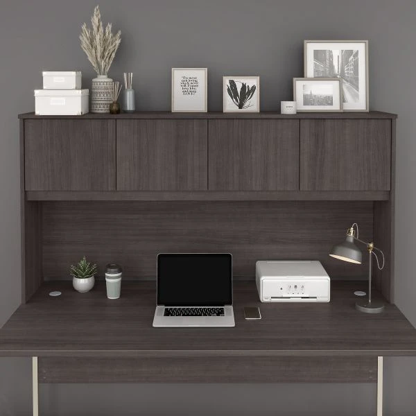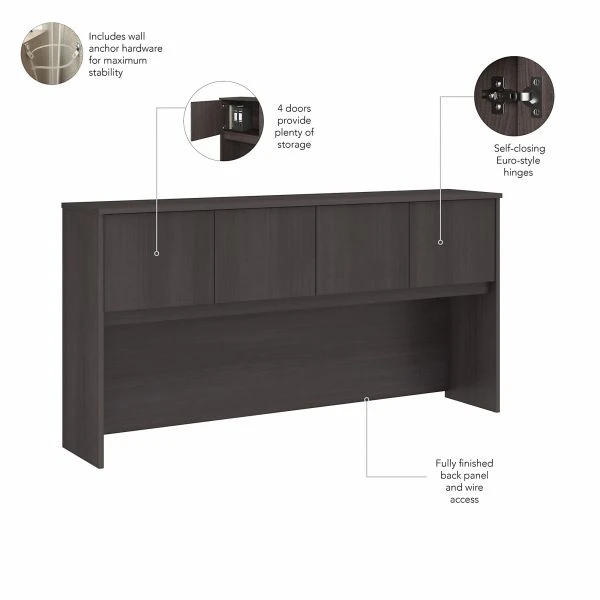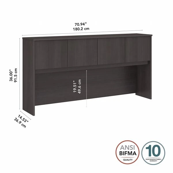 Bush Business Furniture Hybrid 72W Desk Hutch in Storm Gray – The Bush Business Furniture Hybrid 72W Desk Hutch offers a stylish, long-lasting storage solution for the modern professional. Attach the Hutch to a coordinating Hybrid Collection 72W Computer Desk (sold separately) to maintain a neat and orderly workspace. Four cabinet doors conceal books, supplies, equipment, reference materials and more so your desktop remains clutter free. Doors open on smooth Euro-style hinges for an effortless reach to contents. Find the perfect look for your space with five contemporary finish options: Black Walnut, Modern Hickory, Platinum Gray, Storm Gray and White. This computer desk hutch has been meticulously tested to meet or exceed ANSI/BIFMA quality standards for safety, durability and performance and is backed by the Bush Business Furniture 10 Year Manufacturer’s Warranty. American made with U.S. and imported parts.