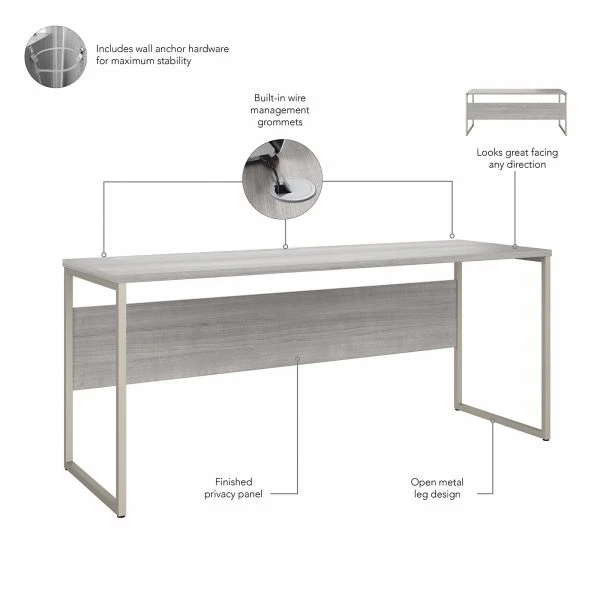 Bush Business Furniture Hybrid 72W x 24D Computer Table Desk with Metal Legs in Platinum Gray – The Bush Business Furniture Hybrid 72W x 24D Computer Table Desk blends a durable work surface with sturdy metal legs to offer a stylish, long-lasting solution for the modern professional. Tackle your next project or assignment with a computer, books, paperwork and more on a desktop that supports up to 200 pounds. Three built-in wire management grommets keep cords and cables in order, so your work area remains free from unnecessary clutter. The Computer Desk’s open leg design and finished privacy panel allow it to look great facing any direction in a home or professional office environment. Find the perfect look for your space with five contemporary finish options: Black Walnut, Modern Hickory, Platinum Gray, Storm Gray and White. This modern desk has been meticulously tested to meet or exceed ANSI/BIFMA quality standards for safety, durability and performance and is backed by the Bush Business Furniture 10 Year Manufacturer’s Warranty. See the full Hybrid Collection for coordinating items to enhance your workspace as needed, including File Cabinets, Bookcases and Storage Cabinets (coordinating items sold separately). American made with U.S. and imported parts.