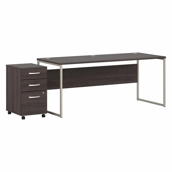 Bush Business Furniture Hybrid 72W x 30D Computer Table Desk with 3 Drawer Mobile File Cabinet in Storm Gray – The Bush Business Furniture Hybrid 72W x 30D Computer Table Desk with 3 Drawer Mobile File Cabinet blends a durable work surface with sturdy metal legs to offer a stylish, long-lasting solution for the modern professional. Tackle your next project or assignment with a computer, books, paperwork and more on a desktop that supports up to 200 pounds. Three built-in wire management grommets keep cords and cables in order, so your work area remains free from unnecessary clutter. The Computer Desk’s open leg design and finished privacy panel allow it to look great facing any direction in a home or professional office environment. The filing cabinet’s bottom drawer accepts letter, legal and A4-size paperwork while a pair of box drawers organize supplies. The two bottom drawers can be locked to protect sensitive files and personal items. Find the perfect look for your space with five contemporary finish options: Black Walnut, Modern Hickory, Platinum Gray, Storm Gray and White. This modern desk with drawers set has been meticulously tested to meet or exceed ANSI/BIFMA quality standards for safety, durability and performance and is backed by the Bush Business Furniture 10 Year Manufacturer’s Warranty. See the full Hybrid Collection for coordinating items to enhance your workspace as needed, including Lateral File Cabinets, Bookcases and Storage Cabinets (coordinating items sold separately). American made with U.S. and imported parts.