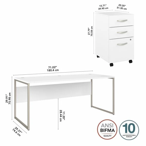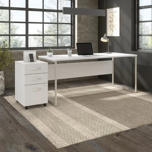 Bush Business Furniture Hybrid 72W x 30D Computer Table Desk with 3 Drawer Mobile File Cabinet in White – The Bush Business Furniture Hybrid 72W x 30D Computer Table Desk with 3 Drawer Mobile File Cabinet blends a durable work surface with sturdy metal legs to offer a stylish, long-lasting solution for the modern professional. Tackle your next project or assignment with a computer, books, paperwork and more on a desktop that supports up to 200 pounds. Three built-in wire management grommets keep cords and cables in order, so your work area remains free from unnecessary clutter. The Computer Desk’s open leg design and finished privacy panel allow it to look great facing any direction in a home or professional office environment. The filing cabinet’s bottom drawer accepts letter, legal and A4-size paperwork while a pair of box drawers organize supplies. The two bottom drawers can be locked to protect sensitive files and personal items. Find the perfect look for your space with five contemporary finish options: Black Walnut, Modern Hickory, Platinum Gray, Storm Gray and White. This modern desk with drawers set has been meticulously tested to meet or exceed ANSI/BIFMA quality standards for safety, durability and performance and is backed by the Bush Business Furniture 10 Year Manufacturer’s Warranty. See the full Hybrid Collection for coordinating items to enhance your workspace as needed, including Lateral File Cabinets, Bookcases and Storage Cabinets (coordinating items sold separately). American made with U.S. and imported parts.