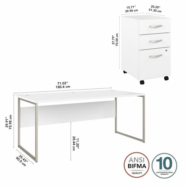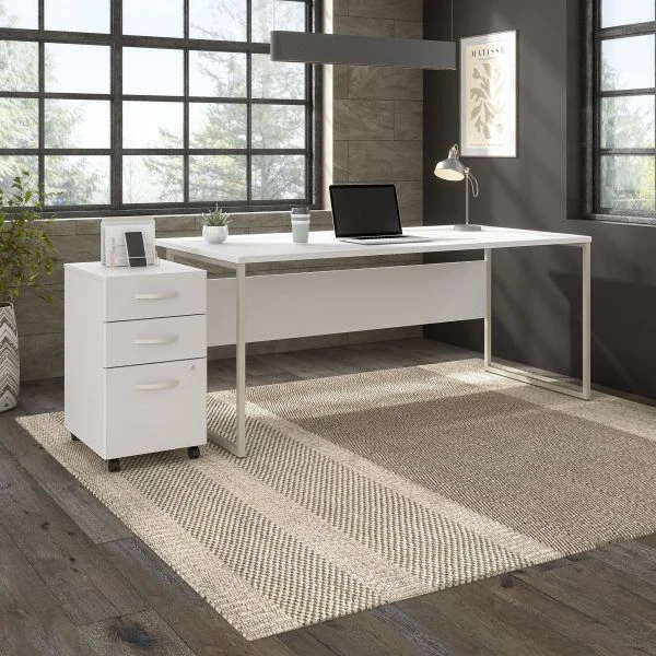 Bush Business Furniture Hybrid 72W x 36D Computer Table Desk with 3 Drawer Mobile File Cabinet in White – The Bush Business Furniture Hybrid 72W x 36D Computer Table Desk with 3 Drawer Mobile File Cabinet blends a durable work surface with sturdy metal legs to offer a stylish, long-lasting solution for the modern professional. Tackle your next project or assignment with a computer, books, paperwork and more on a desktop that supports up to 200 pounds. Three built-in wire management grommets keep cords and cables in order, so your work area remains free from unnecessary clutter. The Computer Desk’s open leg design and finished privacy panel allow it to look great facing any direction in a home or professional office environment. The filing cabinet’s bottom drawer accepts letter, legal and A4-size paperwork while a pair of box drawers organize supplies. The two bottom drawers can be locked to protect sensitive files and personal items. Find the perfect look for your space with five contemporary finish options: Black Walnut, Modern Hickory, Platinum Gray, Storm Gray and White. This modern desk with drawers set has been meticulously tested to meet or exceed ANSI/BIFMA quality standards for safety, durability and performance and is backed by the Bush Business Furniture 10 Year Manufacturer’s Warranty. See the full Hybrid Collection for coordinating items to enhance your workspace as needed, including Lateral File Cabinets, Bookcases and Storage Cabinets (coordinating items sold separately). American made with U.S. and imported parts.