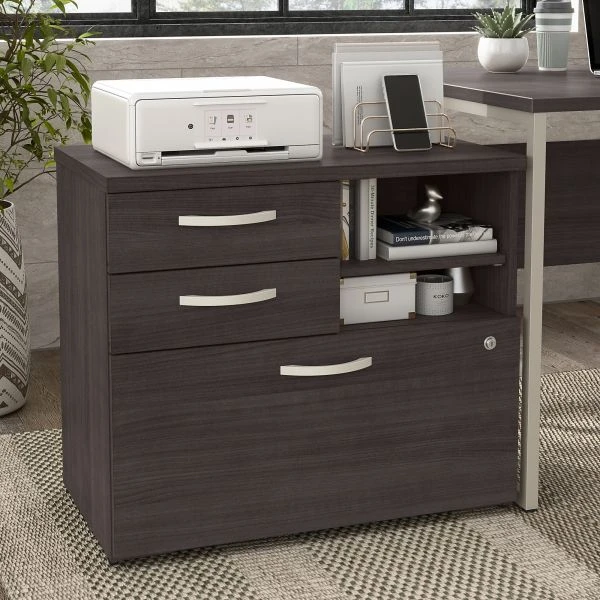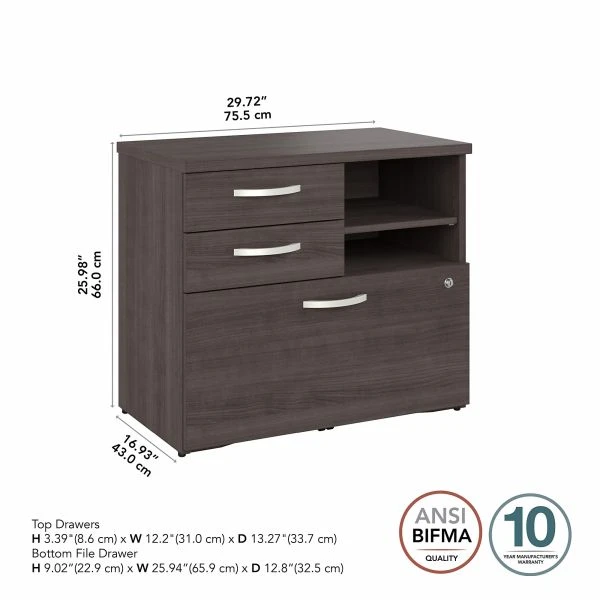 Bush Business Furniture Hybrid Office Storage Cabinet with Drawers and Shelves in Storm Gray – The Bush Business Furniture Hybrid Office Storage Cabinet with Drawers and Shelves offers a stylish, long-lasting workplace organization solution for the modern professional. Keep important documents, office supplies, work-in-progress, and equipment in order so you can access the materials you need quickly and easily. A file drawer opens on smooth full-extension ball bearing slides for an effortless reach to letter, legal and A4-size paperwork and can be locked to protect sensitive information. Two box drawers organize writing utensils, notepads and other supplies while the open shelves are ideal for frequently used items. The file storage cabinet’s stable design and included wall attachment hardware make it a safe choice for use in virtually any home or professional office environment. Find the perfect look for your space with five contemporary finish options: Black Walnut, Modern Hickory, Platinum Gray, Storm Gray and White. This Lateral File Cabinet with Shelves has been meticulously tested to meet or exceed ANSI/BIFMA quality standards for safety, durability and performance and is backed by the Bush Business Furniture 10 Year Manufacturer’s Warranty. See the full Hybrid Collection for coordinating items to enhance your workspace as needed, including Computer Desks, Bookcases and Storage Cabinets (coordinating items sold separately). American made with U.S. and imported parts.