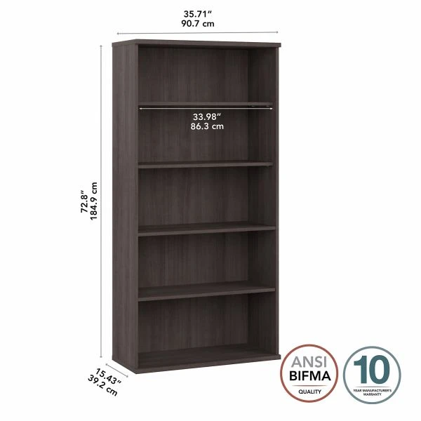Bush Business Furniture Hybrid Tall 5 Shelf Bookcase in Storm Gray – The Bush Business Furniture Hybrid Tall 5 Shelf Bookcase offers a stylish, long-lasting storage and display solution for the modern professional. Organize books and other reference materials or give your workspace a personal touch with pictures and decorations on shelves that support up to 50 pounds each. Two shelves are fixed for stability while three can be raised or lowered to accommodate items of various sizes. The tall bookshelf’s stable design and included wall attachment hardware make it a safe choice for use in virtually any home or professional office environment. Find the perfect look for your space with five contemporary finish options: Black Walnut, Modern Hickory, Platinum Gray, Storm Gray and White. This Tall Bookcase has been meticulously tested to meet or exceed ANSI/BIFMA quality standards for safety, durability and performance and is backed by the Bush Business Furniture 10 Year Manufacturer’s Warranty. See the full Hybrid Collection for coordinating items to enhance your workspace as needed, including Computer Desks, File Cabinets and Storage Cabinets (coordinating items sold separately). American made with U.S. and imported parts.