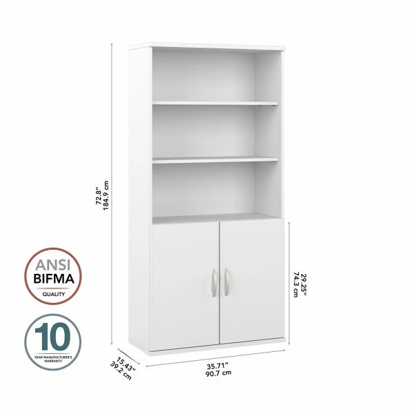 Bush Business Furniture Hybrid Tall 5 Shelf Bookcase with Doors in White – The Bush Business Furniture Hybrid Tall 5 Shelf Bookcase with Doors offers a stylish, long-lasting storage and display solution for the modern professional. Organize books and other reference materials or give your workspace a personal touch with pictures and decorations on shelves that support up to 50 pounds each. Two shelves are fixed for stability while three can be raised or lowered to accommodate items of various sizes. Cabinet doors conceal the two lower shelves for the materials you want kept in order but out of sight. The tall bookshelf’s stable design and included wall attachment hardware make it a safe choice for use in virtually any home or professional office environment. Find the perfect look for your space with five contemporary finish options: Black Walnut, Modern Hickory, Platinum Gray, Storm Gray and White. This tall bookcase cabinet has been meticulously tested to meet or exceed ANSI/BIFMA quality standards for safety, durability and performance and is backed by the Bush Business Furniture 10 Year Manufacturer’s Warranty. See the full Hybrid Collection for coordinating items to enhance your workspace as needed, including Computer Desks, File Cabinets and Storage Cabinets (coordinating items sold separately). American made with U.S. and imported parts.