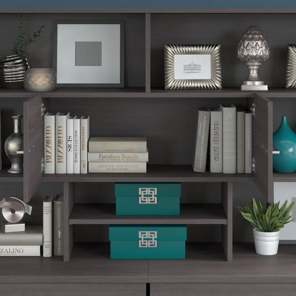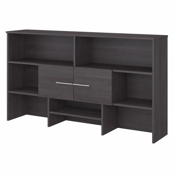 Bush Business Furniture Office 500 72W Desk Hutch in Storm Gray – With its combination of open and closed storage, the Bush Business Furniture Office 500 Desk Hutch is a perfect way to keep any workspace in order while showcasing the style and personality of today’s professional. This 72W Hutch attaches to the coordinating 72W x 24D Credenza Desk, two 36W 2 Drawer Lateral File Cabinets or two 36W Storage Cabinets (coordinating items sold separately). Open cubby spaces on the right and left offer plenty of room to display pictures, professional achievements and other decorations while the large top shelves are ideal for organizing a collection of books. The center of the Hutch features a small storage cabinet that keeps office supplies and reference materials out of sight but easily accessible. Below the cabinet is an adjustable shelf that can be used to store work-in-progress or small electronic devices like a laptop or tablet. Your choice of Black Walnut, Sand Oak, Modern Hickory and Storm Gray finishes with Light Silver hardware make it easy to find the right look for any office environment. This durable Desk Hutch is tested to meet ANSI/BIFMA quality standards for safety and performance and is backed by the Bush Business Furniture 10 Year Manufacturer’s Warranty. American made with U.S. and imported parts. See the full collection for coordinating items available.
