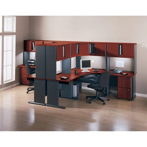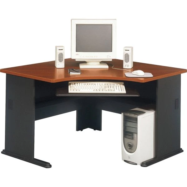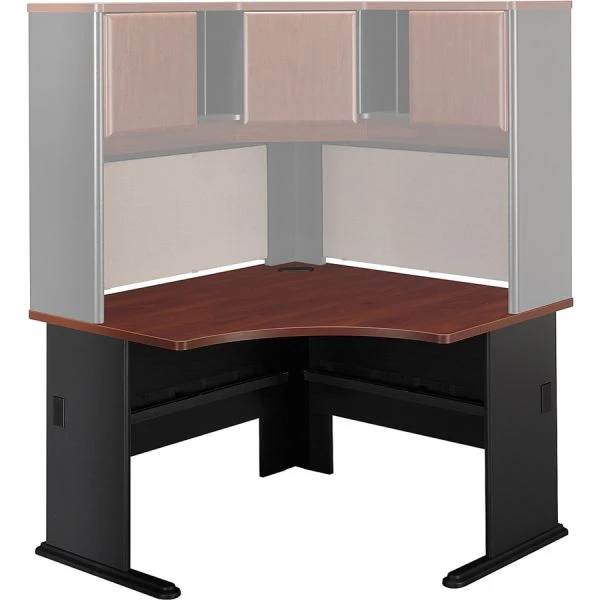 Bush Business Furniture Series A: Hansen Cherry 48W Corner Desk – The Bush Business Furniture 48W Corner Desk maximizes your small office space with a convenient design and commercial-grade quality. Ideal for use in a corner, the Desk provides a comfortable curved work area, and a C-Leg design creates plenty of legroom. A scratch-resistant thermally fused laminate surface and thick end panels fend off damage, while sturdy feet with adjustable levelers ensure stability. Keep your cables in order with wire management grommets. Expand your work surface with coordinating Series A Desks, and add a Hutch, Keyboard Tray or Pencil Drawer (all sold separately). Series A completes your multi-person workspace, classroom, home office or anywhere in between with a variety of layout options. Featuring multiple two-tone finishes and contemporary styling, this commercial office furniture adapts to your surroundings. Customize any environment with a full line of affordable products, all backed by a 10 Year Warranty. Series A withstands the rigors of a 40-plus hour week and meets ANSI/BIFMA quality test standards. American made with U.S. and imported parts.