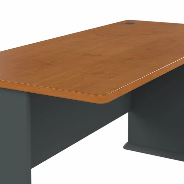 Bush Business Furniture Series A: Natural Cherry 60W Desk – Convenient and comfortable with just the right amount of workspace, the Bush Business Furniture Series A 60W Desk has the commercial quality you need for years of productivity. The durable thermally fused laminate surface fends off scratches and stains while providing room to spread out. Rugged edge banding and thick end panels resist damage as sturdy feet with adjustable levelers ensure stability. The comfortable C-leg design offers loads of legroom, and wire management grommets organize cables to keep them out of your way. The Office Desk accepts a coordinating Hutch, Mobile File Cabinets, Keyboard Tray or Pencil Drawer (all sold separately). Series A completes your multi-person workspace, classroom, home office or anywhere in between with a variety of configuration options. Featuring multiple two-tone finishes and contemporary styling, this commercial office furniture adapts to your surroundings. Customize any environment with a full line of affordable products, all backed by a 10 Year Warranty. Series A withstands the rigors of a 40-plus hour week and meets ANSI/BIFMA quality test standards. American made with U.S. and imported parts.