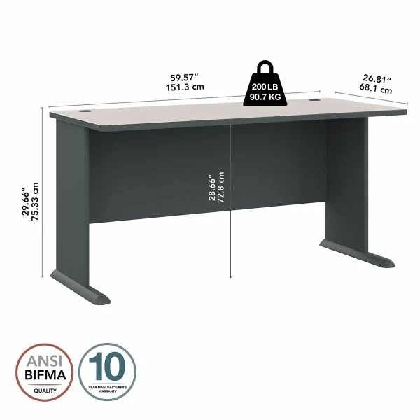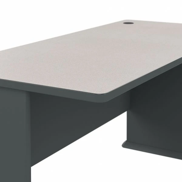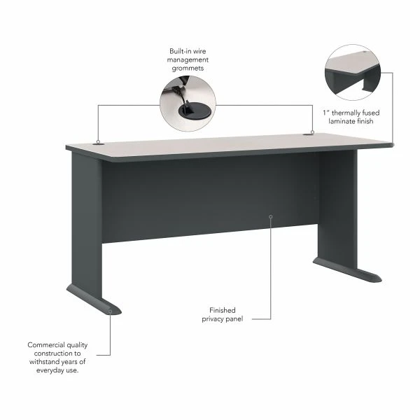 Bush Business Furniture Series A: Slate 60W Desk – Convenient and comfortable with just the right amount of workspace, the Bush Business Furniture Series A 60W Desk has the commercial quality you need for years of productivity. The durable thermally fused laminate surface fends off scratches and stains while providing room to spread out. Rugged edge banding and thick end panels resist damage as sturdy feet with adjustable levelers ensure stability. The comfortable C-leg design offers loads of legroom, and wire management grommets organize cables to keep them out of your way. The Office Desk accepts a coordinating Hutch, Mobile File Cabinets, Keyboard Tray or Pencil Drawer (all sold separately). Series A completes your multi-person workspace, classroom, home office or anywhere in between with a variety of configuration options. Featuring multiple two-tone finishes and contemporary styling, this commercial office furniture adapts to your surroundings. Customize any environment with a full line of affordable products, all backed by a 10 Year Warranty. Series A withstands the rigors of a 40-plus hour week and meets ANSI/BIFMA quality test standards. American made with U.S. and imported parts.