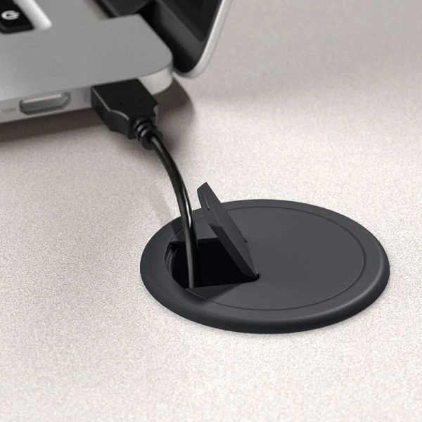 - Wire management system includes leg and desktop grommets with a channel on the modesty panel to keep cables under control